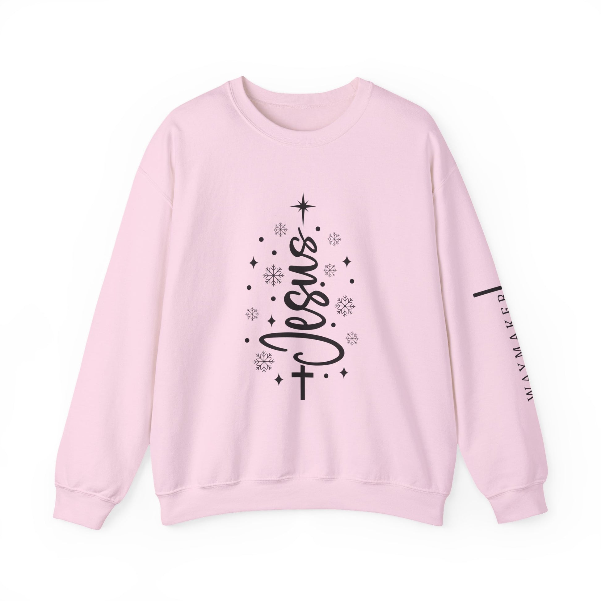This cozy crewneck brings quiet faith into everyday wear. Soft, medium-heavy fabric and a classic fit make it a go-to layer for cool mornings and late-night drives. The vertical “Jesus” script framed by tiny stars and snowflake-like accents reads like a gentle hymn on the chest, while a subtle cross and minimalist type along the sleeve add intentional detail without shouting. Wear it to church socials, holiday gatherings, or during reflective moments at home — it settles like a warm reminder and looks calm and modern in equal measure.