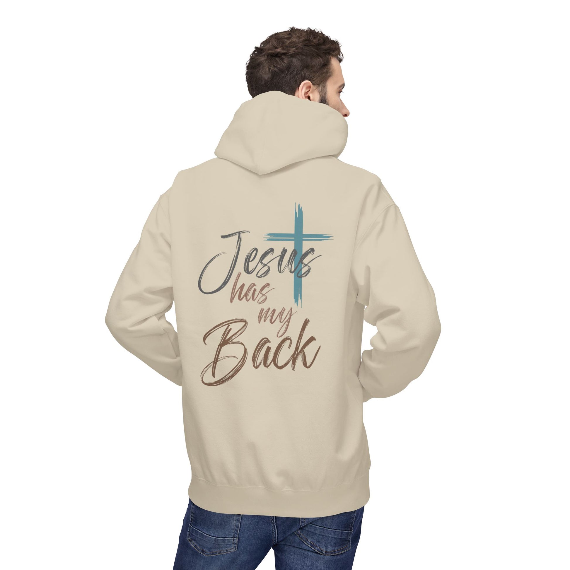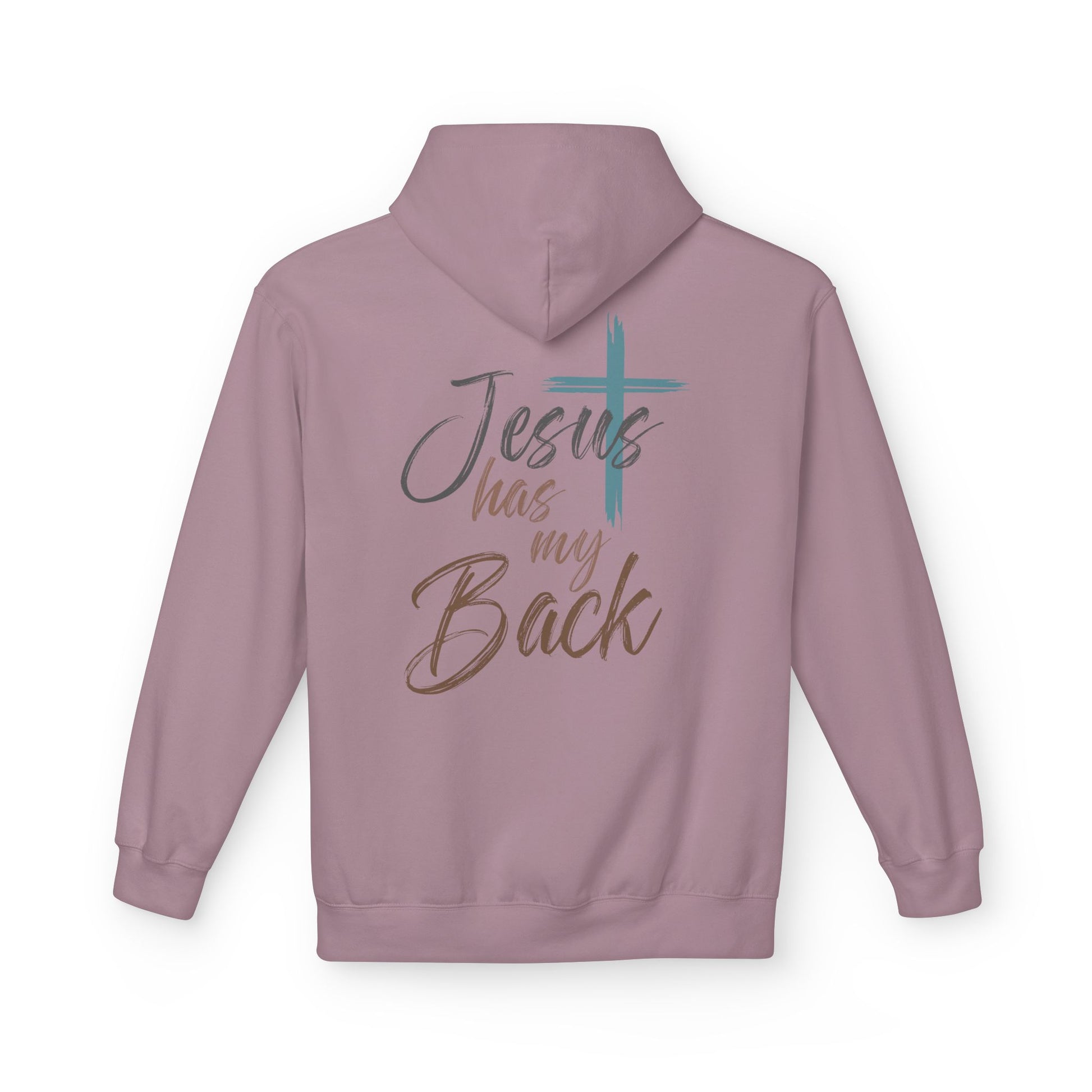 unisex Christian Hoodie — "Jesus Has My Back" Cross & Heart Faith Pullover